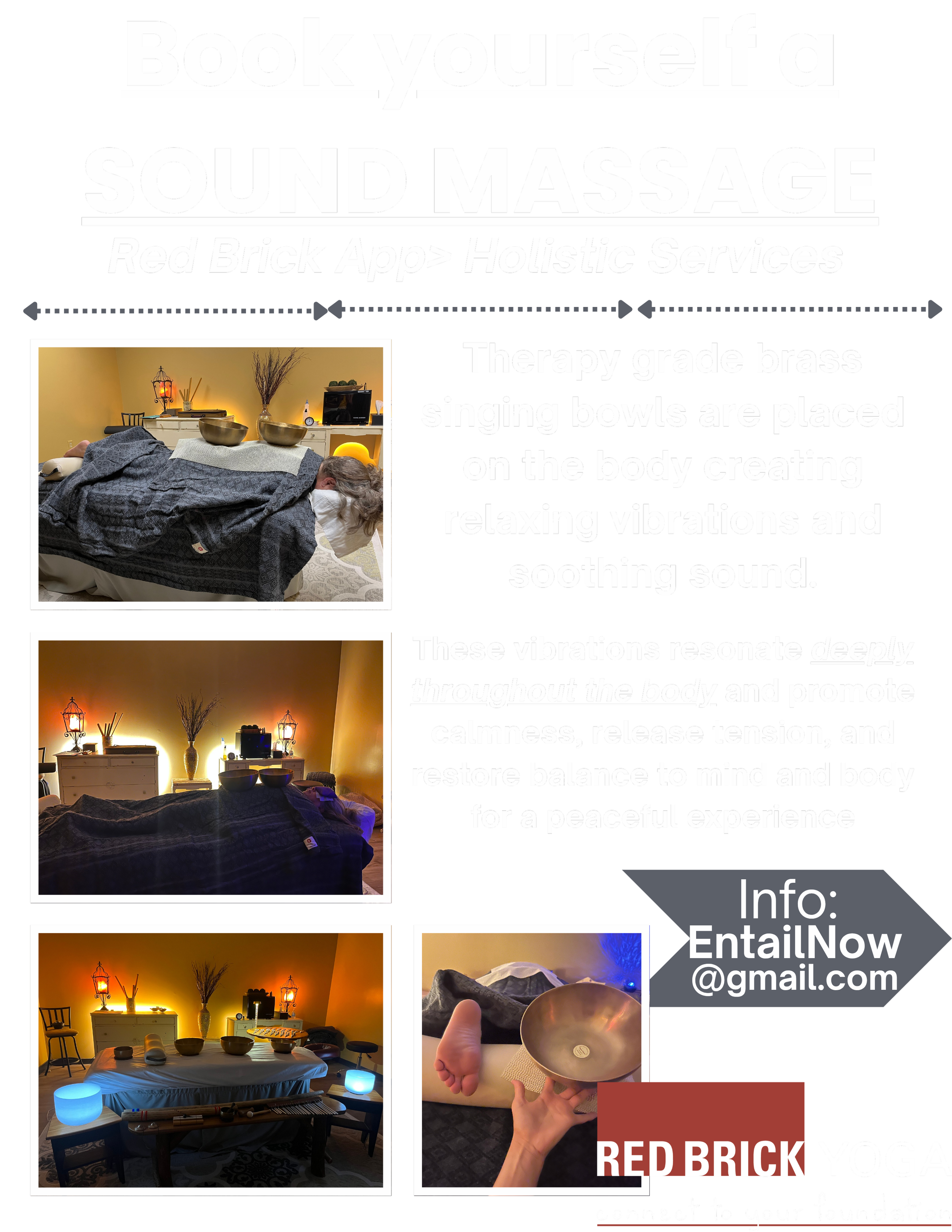 Oct 19 @ 6:30pm Soothing Sound Bath Nov 30 @ 7pm Sound Journey Experience Dec 16 @7:30pm Sonic Cocoon Guided Meditation Jan 11 @ 7pm Soothing Sound Bath Feb 3 @ 7:30pm Sound Massage + Restorative yoga Feb 22 @ 7pm Sound Journey Experience